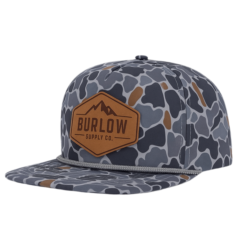 Dark, strong, and dependable—just like its name. The Ironwood features a deep gray and black camo with subtle brown undertones, making it versatile enough for both the city and the backcountry. A braided gray rope detail and the Burlow Supply Co. leather patch give it a premium finish that balances utility with style.